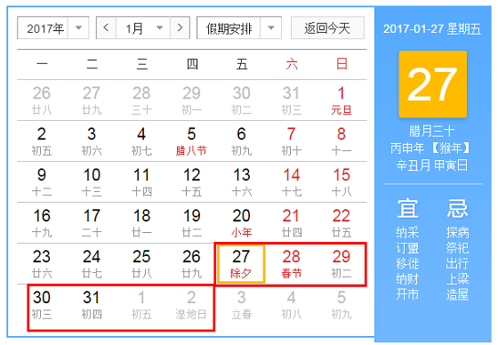 1月27日(星期五,農(nóng)歷除夕)、1月28日(星期六,農(nóng)歷正月初一)、1月29日(星期日,農(nóng)歷正月初二)為法定節(jié)假日